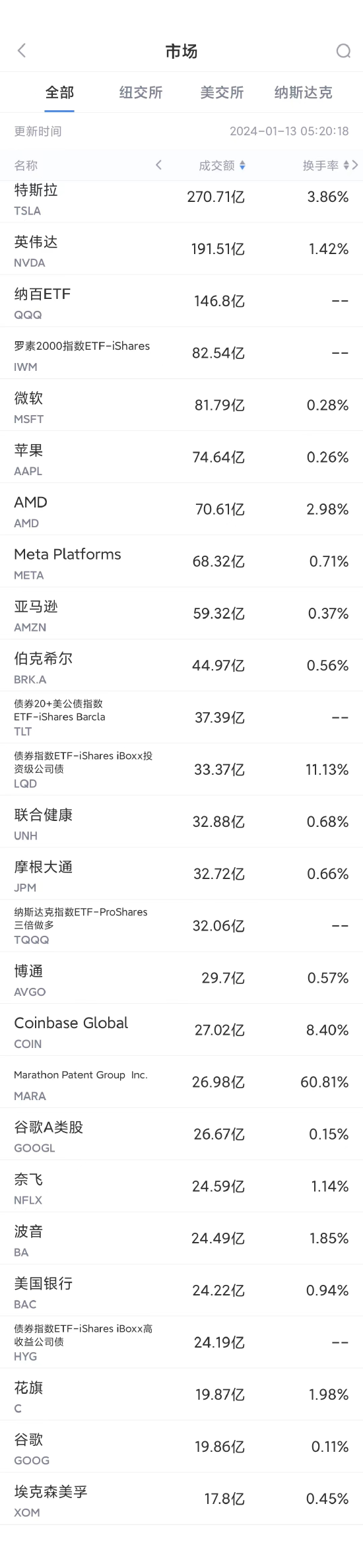 1月12日美股成交额前20:微软超越苹果成美股市值最大公司 配资炒股平台